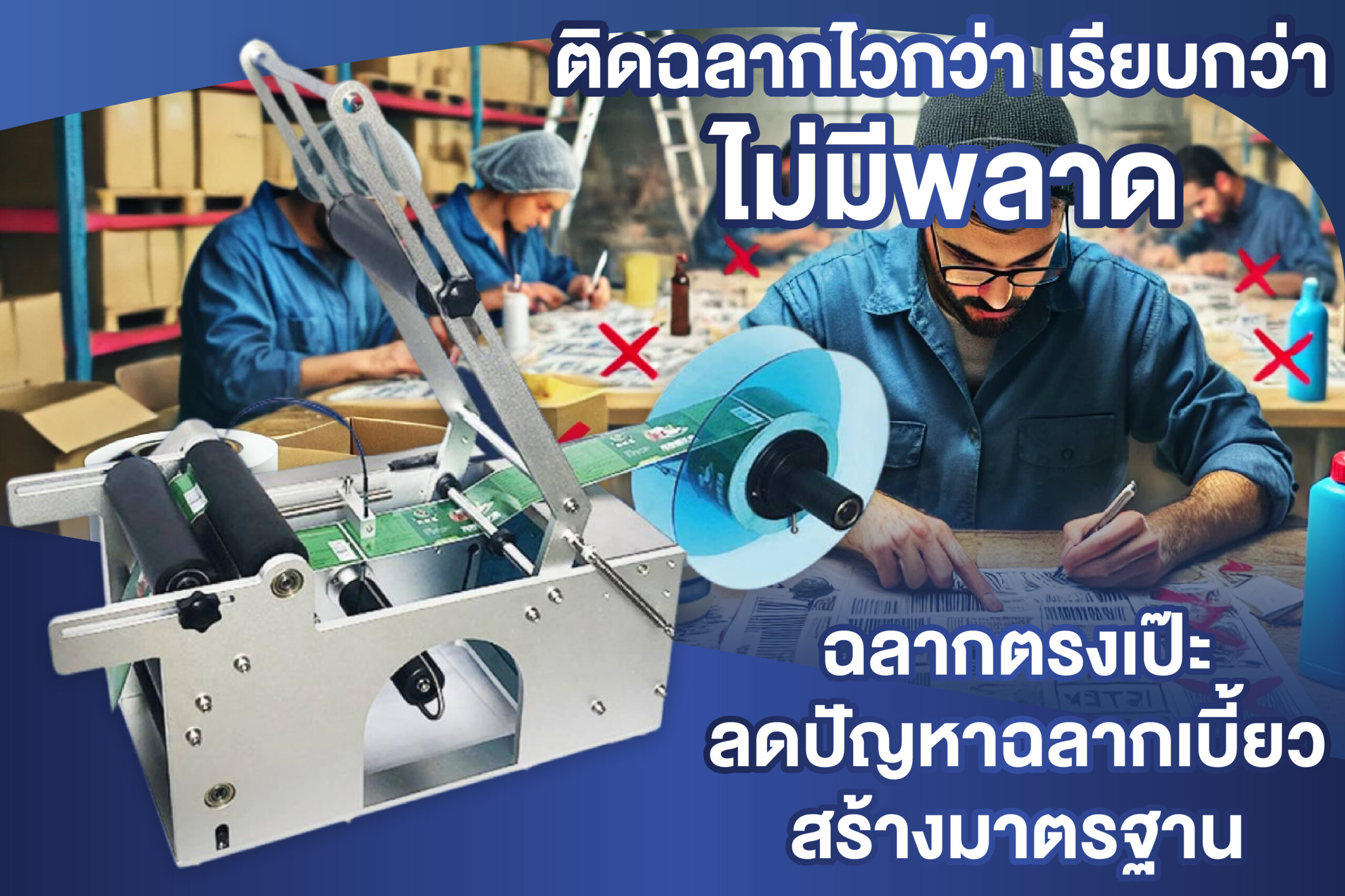 - ลดความผิดพลาดจากมนุษย์: การติดฉลากด้วยมือมีความเสี่ยงต่อความผิดพลาด เช่น ฉลากติดไม่ตรง ฉลากเอียง หรือฉลากติดไม่ครบ ซึ่งอาจนำไปสู่การเสียเวลาในการแก้ไข การทิ้งสินค้า หรือแม้กระทั่งการสูญเสียลูกค้า เครื่องแปะฉลากช่วยลดความผิดพลาดเหล่านี้ได้อย่างมาก ทำให้ประหยัดต้นทุนที่เกิดจากการแก้ไขหรือทิ้งสินค้า